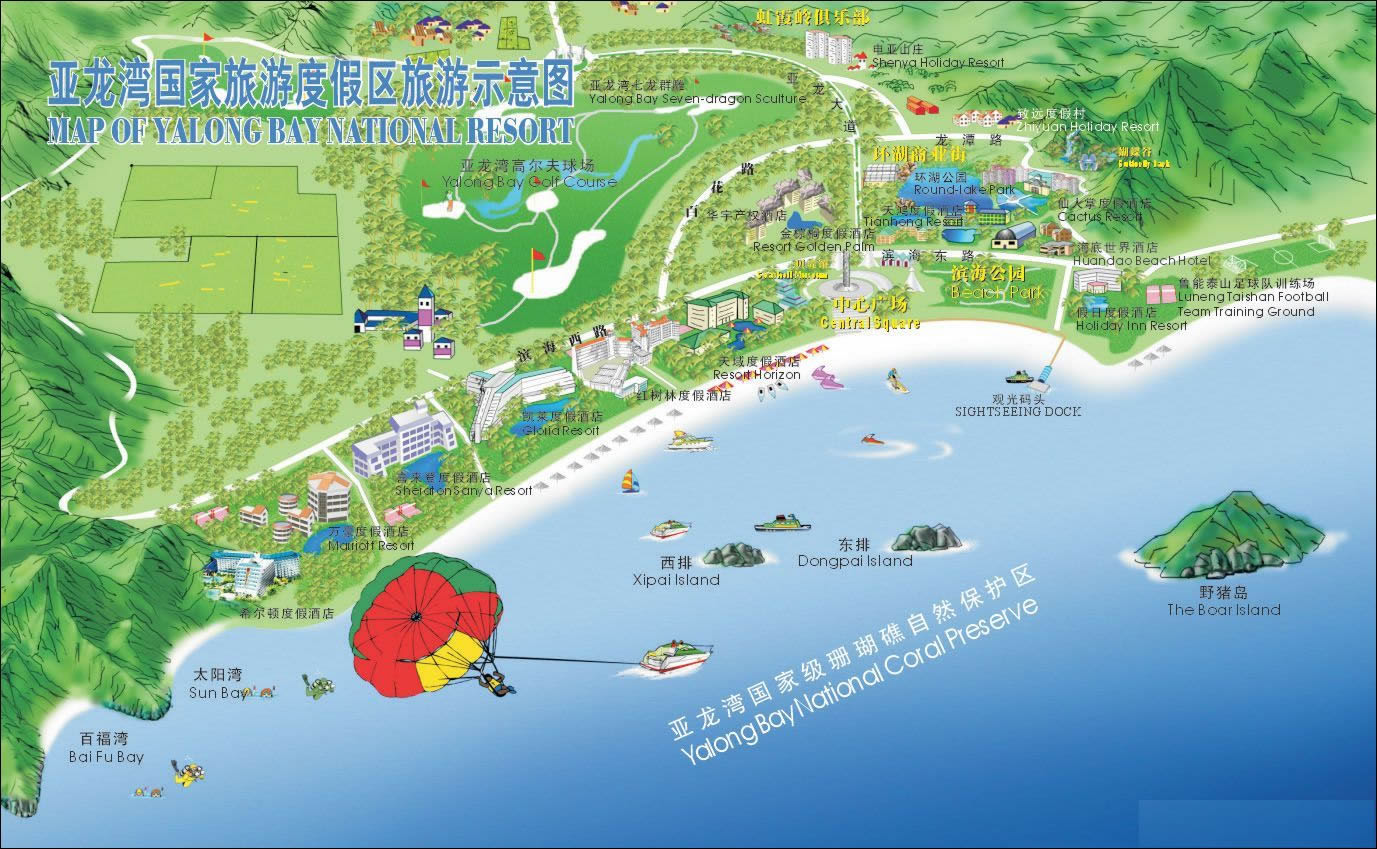 這里三面青山相擁,南面月牙型向大海敞開。除陽光、海水、沙灘俱佳外,尚有奇石、怪灘、田園風(fēng)光構(gòu)成了各具特色的風(fēng)景。錦母角、亞龍角激浪拍崖,怪石嶙峋,是攀崖探險活動的良好場所。海面上以野豬島為中心,南有東洲島、西洲島,西有東排、西排,可開展多種水上運動。亞龍灣中心廣場有高達27米的圖騰柱,圍繞圖騰柱是三圈反映中國古代神話傳說和文化的雕塑群。廣場上,四個白色風(fēng)帆式的尖頂帳篷,給具有古老文化意蘊的廣場增添了現(xiàn)代氣息。