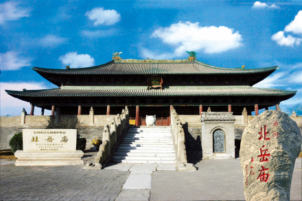 北岳廟,原名“北岳安天元圣帝廟”。位于保定市曲陽縣境內,是漢代和清朝封建皇帝遙祭北岳恒山的地方。北岳廟建于北魏宣武帝年間(500~515年),唐開元二十三年(735年)擴建。明嘉靖年間(1522~1566年),北岳廟規(guī)模達到頂峰。清順治十七年(1660年),改祀北岳于山西渾源,曲陽北岳廟逐漸荒廢。北岳廟主要建筑平面布局呈“田”字形,長達542米、寬321米,坐北朝南排列在一條垂直中軸線上,由南往北依次為登岳橋、神門、牌坊、朝岳門、御香亭、凌霄門、三山門、飛石殿、德寧之殿、后宅門、望岳橋。