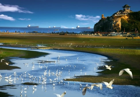 北戴河景區(qū)地處河北省秦皇島市北戴河區(qū)東部沿海,東北至鴿子窩公園,是著名的觀鳥勝地,被譽(yù)為"觀鳥的麥加"。這里有6600多公頃森林,50多畝濕地,戴河、恒河等入?谛纬傻哪酁、瀉湖以及滯緩的河道,被國(guó)際濕地保護(hù)公約命名為"北戴河濕地",并受到國(guó)家保護(hù)。