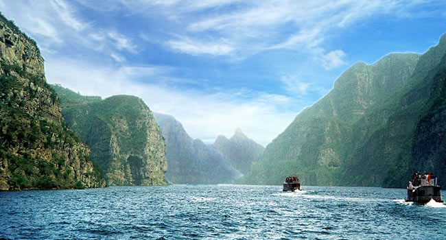 黃河三峽是小浪底與王屋山所孕育的精華,位于小浪底水庫大壩上游20公里處,總面積40平方公里, 是小浪底風(fēng)景區(qū)的精華所在。八里胡同位于黃河中下游最窄處,兩岸斷壁如削,中間河水奔涌,三條峽谷各具風(fēng)采:孤山峽鬼斧神工,千仞壁立;龍鳳峽盤龍走蛇,曲折迂回;大峪峽開闊舒展,氣象萬千。特別是九蹬蓮花棧,九蹬九級(jí),次第升高,望之若蓮花盛開,似出水芙蓉,號(hào)稱“鯀山禹斧”。是我國北方少有的山水景觀,可以和長(zhǎng)江三峽媲美。