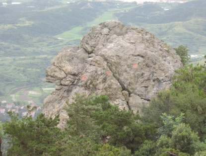 棋盤石:位于木蘭山山脊,在木蘭山風(fēng)景區(qū)售票處北偏西413米處,是一處已因構(gòu)成作用而松動(dòng)的巨大變基火山巖(綠片巖)巖塊,石頭有一條寬約0.8米的拉張裂縫,險(xiǎn)竣異常。棋盤石形成的地質(zhì)年代為距今7.5--8億年的新元古代,那條裂縫的形成,則是與新構(gòu)造活動(dòng)有關(guān)。