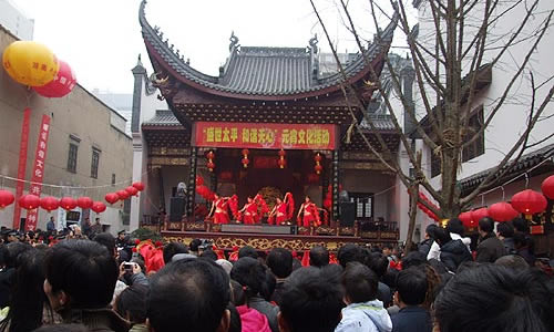 在南岳古鎮(zhèn)一帶,人們別出心裁在水上放燈迎春或送春。燈系彩紙精制成荷花狀,經(jīng)熟桐油浸透后再以松香涂抹,使之不滲水,花芯灌少量茶油,再插燈芯,點(diǎn)燃后放入古鎮(zhèn)內(nèi)外諸溪流中,任其飄流,小溪便宛如閃光的“燈龍”。觀燈者成千上萬,川流不息,場(chǎng)面頗為壯觀。
