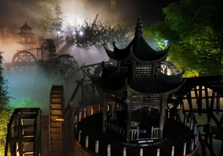 風(fēng)雨長廊位于田園牧歌景觀區(qū)東頭,取臥龍之形,伸展于山谷之中,從田野一直延伸到黃龍洞進(jìn)口。風(fēng)雨長廊為木質(zhì)吊腳樓穿斗結(jié)構(gòu),做工十分精細(xì),榫卯巧妙連接,雖然不用一顆鐵釘?shù)珔s非常穩(wěn)定、堅(jiān)固。置身長廊,不僅可以防止日曬雨淋,還可以品讀富有地域特色的湘西建筑文化。