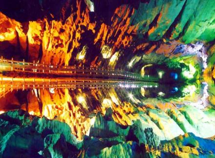一條小溪穿洞而過,水流平緩,燈光打在巖壁上,皺襞倒影在水中,如夢如幻。巖洞用五光十色的霓虹燈打在石筍、石幔及石花上,營造出...