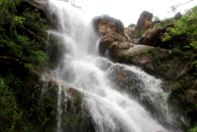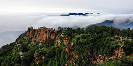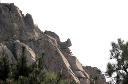 從遠處山腰眺望一線天,這里就是著名的八戒石.很像一個戴著僧帽的老豬在綠樹叢中呼呼大睡。一線天下面是花果山山名摩崖石刻,游客都愛在這里留影,青山紅字,非常壯麗。這里還有天然碑、硯石等景觀。沿小路前進可至墨香小徑,里面有百余位當代書法名家的作品刻在天然石塊上;還可至怪石園,看千奇百怪與《西游記》有關的象形石!吧瘛弊滞踉跂|部禿龍溝下,是刻在山體上的懷素草書“神”字,長39.4米、寬15.8米,為世界上最大的單體漢字,1996年被載入吉尼斯世界紀錄。 登上玉女峰是花果山之游的高潮,有緣的人在這里可看到云臺山兩個最為精彩的景致。一個是在迎曙亭看海上日出;另一個是看云臺鋪海,白云翻滾好像海水揚波,露出來的峰頂就像大海里的蓬萊仙島,群山俯伏,阡陌縱橫,此情此景令人有飄飄欲仙的感覺。
