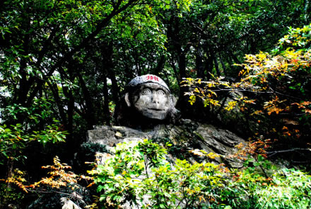 花果山的一草一木,都因為一部《西游記》而充滿神韻,從怪石園東部唐僧崖向南有一條石板路,通往眺望“神”字王的最佳方位——觀神臺,路旁邊的崖壁上有若干名家書寫的字體不一、大小各異、風韻不同的“神”字摩崖石刻,一路“神”味十足,叫做“神路”。