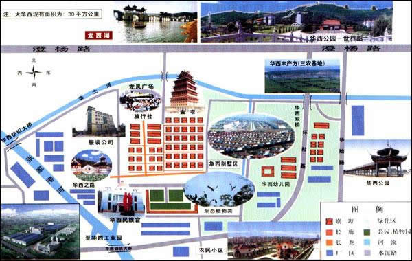 村頭粉墻照壁,后為廣場。廣場上數(shù)十旗桿,飄揚(yáng)著各種圖案的彩旗,這是華西實業(yè)公司所屬工業(yè)的標(biāo)志,顯示出它的經(jīng)濟(jì)實力,產(chǎn)值數(shù)十億,產(chǎn)品遠(yuǎn)銷國外。