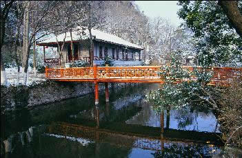 狼山南暢北幽,北麓可謂“蟬噪林逾靜,鳥鳴山更幽”。這里林溪環(huán)繞,處處成景。在趙繪沈繡之樓西,香爐峰下有林溪精舍,與觀音禪院相鄰,建于1916年。精舍即書齋和講學之所,佛教修行有布施、持戒、忍辱、精進、禪定、智慧六度,精舍又取精進之舍之意。林溪精舍匾額為書法家秦能所書,下懸有張謇撰、孫淼書“已尋嵐壁臨空盡,別構新齋與竹齊”的門聯(lián)。林溪精舍旁的林溪是張謇在狼山規(guī)劃建立植棉試驗場而開辟的灌溉河,此地原來十分荒蕪,不通水利,無以灌溉,張謇特為開鑿護山河經(jīng)小洋港而通長江。水利既通,山水環(huán)抱,林木相依,張謇就依溪筑此林溪精舍。當年精舍之北還有一座木橋橫跨溪上。自狼山遠處見“五山拱北”摩崖大字巍然,穿曲徑,跨棧橋,至幽林中方見林溪精舍臥于水邊,景致極為宜人。張謇晚年自稱居士,在此流連忘返。林溪精舍的門上貼有“嗇庵居士習靜之所”的字條。