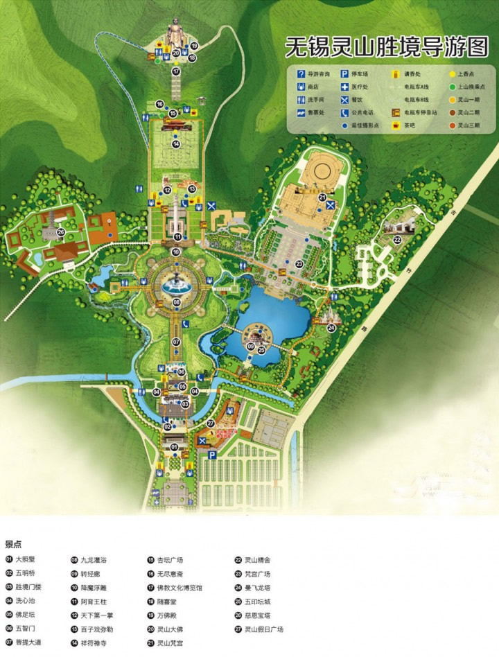 要的關(guān)系。靈山勝境的整個(gè)地形尤如一張?zhí)珟熞,背靠小靈山,左邊青龍山,右邊白虎山,北踏青峰,盡攬山形之美,南望太湖,一挹水色之秀,這種傳統(tǒng)風(fēng)水理論上稱為"八風(fēng)吹不動,端坐紫金蓮"的地形是大吉之地,為保存這吉祥的靈氣,所以造大照壁來收氣,同時(shí)也通過照壁上的內(nèi)容引領(lǐng)游客走進(jìn)靈山的佛教文化歷史世界。
