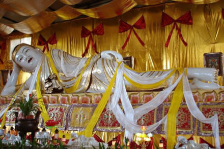 釋迦牟尼涅槃像由名貴的緬甸白玉精雕細琢而成。白玉毛料1999年在緬甸發(fā)現,歷經三年艱苦開采,始現于世。玉料為一塊完整一體的純天然玉料。據玉材的天然造型,經過精心設計,由德純藝高的工匠歷兩年時間精工雕成。佛像長8.9米,高2.45米,總寬1.35米,體型比例均確。玉佛全身鑲嵌有1500多粒紅、藍、紫晶寶石和翡翠,衣紋和蓮花臺由24K黃金鎦金而成,彩繪部分采用天然石色彩畫而成。