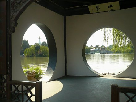 揚州是中國的月亮城,揚州賞月的地方很多,月觀就是其中之一。月觀坐西朝東,前臨開闊的湖面,每當皓月東升,憑欄而立,天上水中的兩個月亮交相輝映。月觀中的海梅家具也很有特點,雕刻的內容都和賞月有關。蓮花、鴛鴦、荷葉,藕節(jié)是揚州木雕工藝的代表作品。
