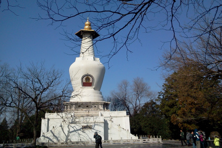 白塔身白色,也稱觀音寺白塔。塔平面呈八角形,由高大的束腰須彌座、八角重檐亭式塔身、碩大的率堵波和頂部的十三天相輪組成。白塔高27.5米 ,下面是束腰須彌塔座,八面四角,每面三龕,龕內雕刻著十二生肖像。和北海白塔的厚重穩(wěn)健不同,白塔比例勻稱。