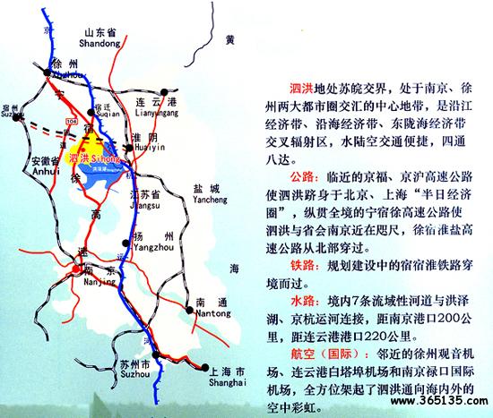 泗洪地處蘇皖交界,位于南京、徐州兩大都市圈交匯中心地帶,是沿江經(jīng)濟(jì)帶、沿海經(jīng)濟(jì)帶、東隴海經(jīng)濟(jì)帶交叉輻射區(qū)。水陸空交通便捷,四通八達(dá)。