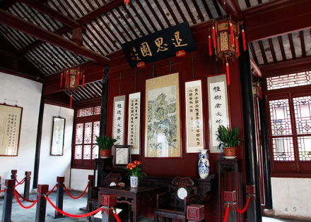 主建筑仿明代結(jié)構(gòu),俗稱“紗帽廳”。因梁頭棹木像明代官帽的帽翅,故名。該庭院高大寬敞,肅穆莊重。五架梁兩側(cè)中心刻有“八駿圖”,梁兩端刻有“鳳穿牡丹”。梁底則刻有“稱心如意”、“必定高中”等圖案!凹喢背帷保戳侯^棹木)上刻有《三國演義》中的“古城會、三英戰(zhàn)呂布”等八幅戲文透雕,形象逼真,呼之欲出。這組透雕被《中國戲曲志·蘇州分卷》收錄。