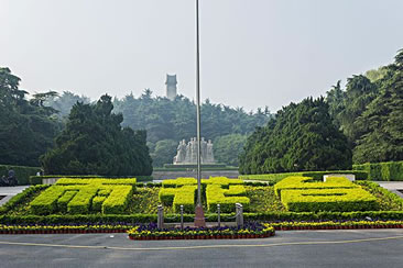 兩側(cè)的環(huán)陵大道可直達(dá)雨花臺(tái)主峰,主峰上矗立著一塊42.3米高的石碑,碑身正面鐫刻著鄧小平親筆題寫(xiě)的"革命烈士紀(jì)念碑"七個(gè)金字,背面刻著紀(jì)念碑文。碑前還豎有一座高5.5米的烈士青銅塑像。在紀(jì)念碑南邊的山崗上還有一座呈"U "字型,頗具民族風(fēng)格的花崗巖結(jié)構(gòu)的大型建筑--"革命烈士紀(jì)念館"。館長(zhǎng)94米、寬49米,主堡高26米,建筑面積5900平方米,館內(nèi)陳列著烈士們的遺像、遺書(shū)和遺物等。
