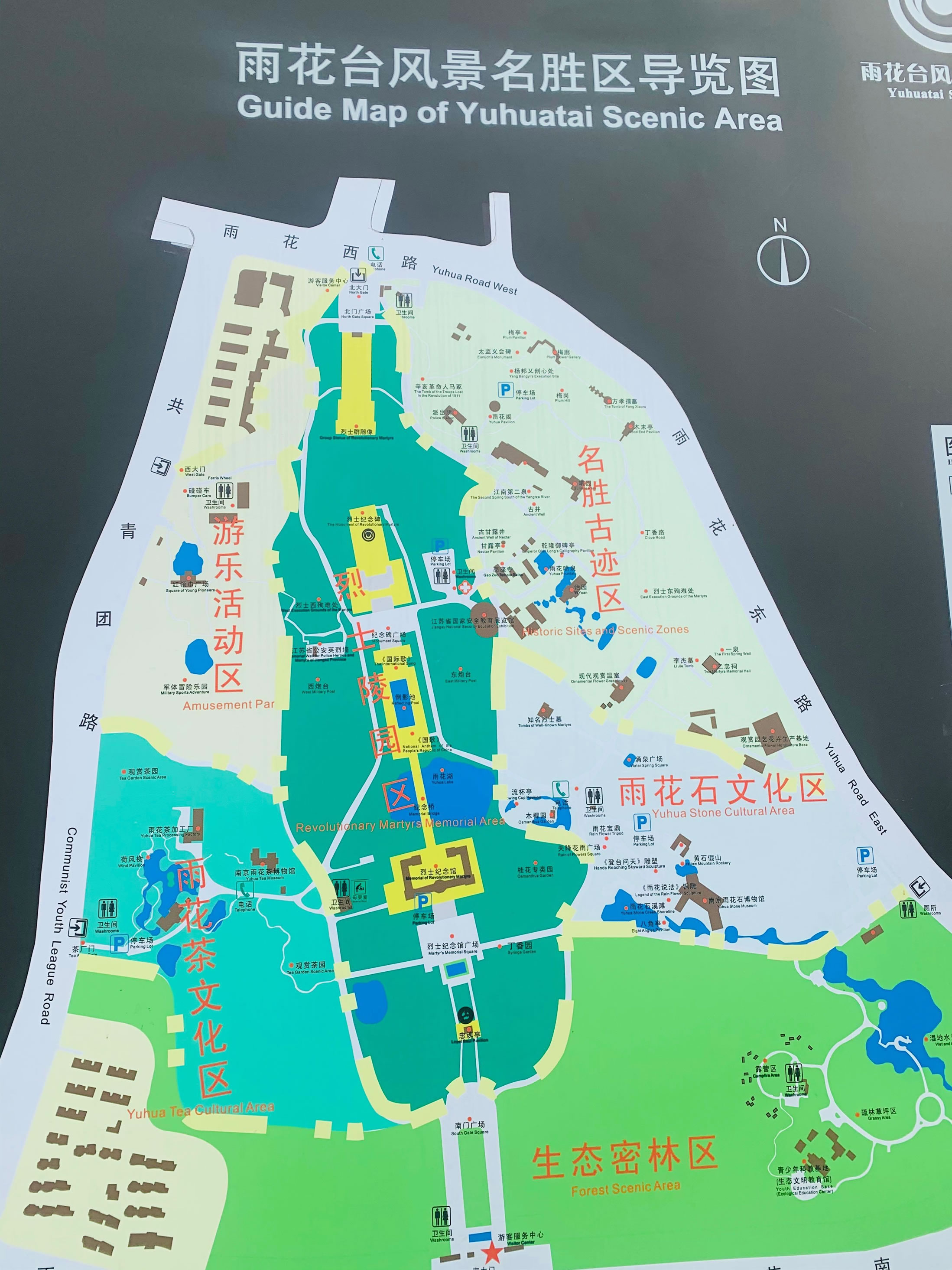 雨花臺(tái)風(fēng)景名勝區(qū)由名勝古跡區(qū)、烈士陵園區(qū)、雨花石文化區(qū)、雨花茶文化區(qū)、游樂(lè)活動(dòng)區(qū)和生態(tài)密林區(qū)六大功能區(qū)組成。復(fù)建了雨花閣、二忠祠、木末亭、乾隆御碑亭、方孝孺墓、辛亥革命人馬冢、甘露井、曦園、怡苑、梅崗等20余處名勝古跡和樓臺(tái)亭閣館。