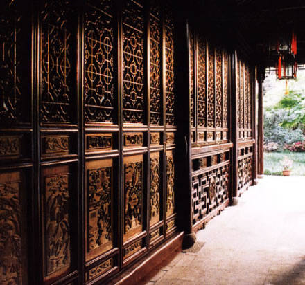 秫香館:秫香,指稻谷飄香。此處以前墻外皆為農(nóng)田,豐收季節(jié),秋風(fēng)送來一陣陣稻谷的清香,令人心醉,館亦因此得名。秫香館為東部的主體建筑,面水隔山,室內(nèi)寬敞明亮,長窗裙板上的黃楊木雕,共有48幅,雕鏤精細(xì),層次豐富,栩栩如生。落地長窗加上精致的裙板木雕,把秫香館妝點(diǎn)得古樸雅致,別有情趣。