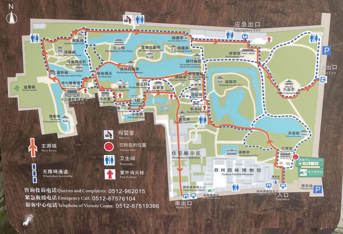 全園分東、中、西三部分。總體布局特點(diǎn),東疏西密,綠水環(huán)繞,水面面積約占全園面積1/3,水是全園的紐帶和靈魂。東部地勢(shì)空曠,平崗草地,竹塢曲水,芙蓉樹、天泉亭等亭閣點(diǎn)綴其間。蘭香堂是東部主廳,廳中部屏門南側(cè)為漆雕《拙政園全景圖》,把全園景色融于一壁。中部以遠(yuǎn)香堂為主體,山水明秀,廳榭典雅,花木繁茂,是全園的精華所在。從東部進(jìn)入中園,一泓清池映入眼簾,古樹,垂柳拂水,湖石峻秀。遠(yuǎn)處一洞隱約可見。池南廳堂林立,錯(cuò)落有致。池北巖島,溪橋相連,百年楓楊。