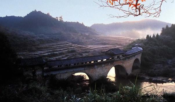 玉帶橋:因其弧形如玉帶,故名。玉帶橋?yàn)楫?dāng)?shù)馗晃逃囡L(fēng)歧募資建于清乾隆五年(公元1740年),又名“風(fēng)歧橋”。玉帶橋?yàn)槎杖孜輼鞘焦皹,橋身成弧行,橋長88.15米,是江南現(xiàn)存最長的弧形廊橋,它以結(jié)構(gòu)獨(dú)特,氣勢雄偉而聞名贛粵。留下了“遠(yuǎn)近聞名玉帶橋,兩岸峻峰入云霄。奔騰河水瀉千里,玉帶飛鎮(zhèn)兩山腰”的贊譽(yù)。