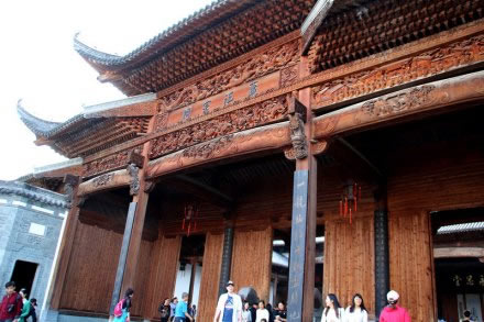 蕭江宗祠 又名永思祠,座落在婺源縣江灣鎮(zhèn)占坑村,距婺源縣城32公里,江灣約2公里。始建于明朝萬(wàn)歷六年(1587年),后毀于太平天國(guó)戰(zhàn)火。1924年(民國(guó)十三年)重建,文化大革命期間又被拆毀。蕭江宗祠曾被譽(yù)為江南七十座著名宗祠中“最好的一座宗祠”為婺源古代四大古建之首。2003年9月,第三次重建。該祠盡顯王室氣派,占地面積達(dá)2400平方米,分前院、前堂、中堂、后堂四進(jìn)。前院為寬敞花園,設(shè)有青石護(hù)欄半月形蓮花池,內(nèi)養(yǎng)紅鯉魚(yú)、草魚(yú)、軍魚(yú)等多種魚(yú)類;前堂為五鳳樓、九脊頂、午朝門、月樓,梁材檐椽巧飾雕琢、畫面生動(dòng)、形態(tài)逼真;中堂粗梁大柱,鼓式石礎(chǔ),石階、石欄、月臺(tái)各具特色,匾額楹聯(lián)措詞秀麗、授意深長(zhǎng);后堂高于前堂,有樓閣安放靈牌。