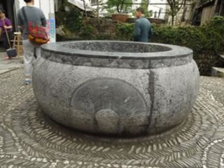 北斗七星井位于江西省上饒市婺源縣江灣鎮(zhèn)江灣景區(qū)內(nèi),北斗七星井體現(xiàn)了”天、地、人合一”的中國(guó)風(fēng)水學(xué)最高原則,南側(cè)梨園河呈太極圖“S”形系。北宋初年,南唐國(guó)師何令通遭貶來(lái)到江灣靈山隱居,與蕭江六世祖江文采交往甚篤,便指引蕭江氏族人由旃坑遷居風(fēng)水寶地云灣(現(xiàn)為江灣)。蕭江先祖在他的指引下,利用風(fēng)水學(xué)的最高原理,對(duì)江灣的水系環(huán)境、建筑布局、街衢走向,山脈走勢(shì)等方面進(jìn)行了改造。族人自遷云灣后人丁日益興旺、科第舉發(fā),其中村內(nèi)的北斗七星井便是國(guó)師運(yùn)用風(fēng)水學(xué)的典范。 中國(guó)古代的四個(gè)方位分別是“前朱雀后玄武、左青龍右白虎”,而江灣的地勢(shì)是玄武(后龍山)偏低,朱雀(對(duì)面攸山)偏高,朱雀屬火,也就是說(shuō)南方火勢(shì)較旺,是一個(gè)較為不利的地形。當(dāng)時(shí)何令通便想出在村中挖七口井,并按北斗七星狀分布,以七井之水鎮(zhèn)住攸山火勢(shì)。而北斗七星分布又是呈勺子狀的,從此,村內(nèi)即有了充足水源又有了舀水的勺子,攸山之火自然就被鎮(zhèn)住了。