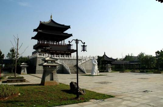 潯陽樓占地面積2800平方米,主樓建筑面積1000平方米,為仿宋建筑風格,花崗巖石料臺基,九脊頂,外三層內(nèi)四層,高21米。潯陽樓之名最早見之于唐代江州刺史韋應物的詩中!端疂G傳》小說中的宋江題反詩、李逵劫法場等故事使?jié)£枠敲胩煜。潯陽樓的設計,參考了《清明上河圖》和《水滸傳》刻本中的潯陽樓插圖!皾£枠恰比齻大字,為趙樸初所題。