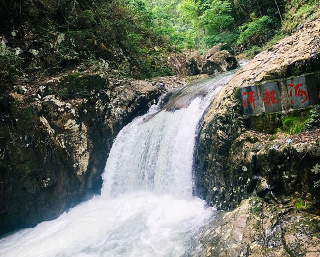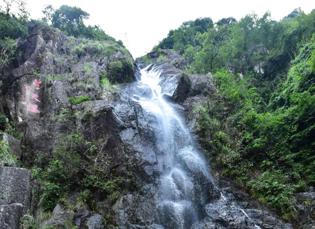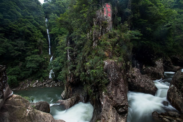 東江第一瀑由福鰲塘和山上大小溪流匯集而成,瀑布單級落差120多米,是目前景區(qū)發(fā)現(xiàn)單級落差最大的常流瀑布,氣勢雄偉,兩側峭壁凌空,古木參天。飛瀑前方視野開闊,遠處青山疊翠,林海蒼茫,令人心曠神怡。石壁上東江源三個字是由全國政協(xié)原副主席葉選平題寫。