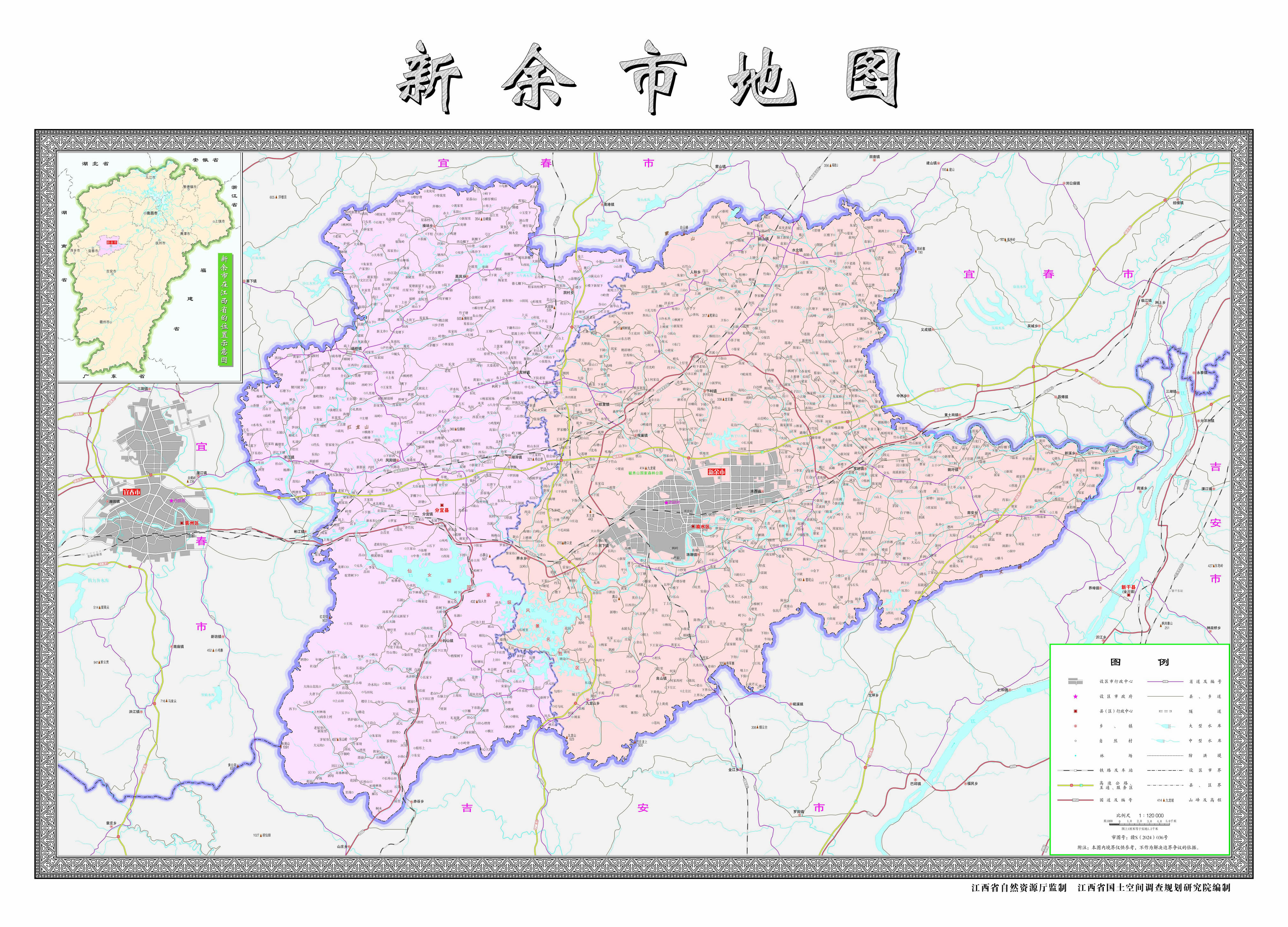新余市位于江西省中部偏西,浙贛鐵路西段。全境東西最長處101.9千米,南北最寬處65千米,東距省會南昌市150千米,東臨樟樹市、新干縣,西接宜春市袁州區(qū),南連吉安縣、安?h、峽江縣,北毗上高縣、高安市。總面積3178平方千米,占江西省總面積的1.9%。