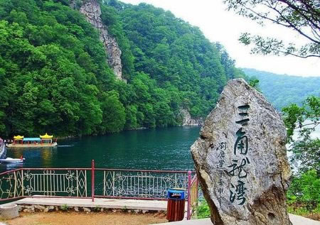 三角龍灣又名黑龍?zhí)叮瑐髡f(shuō)有一條三只角的黑龍距此修煉,經(jīng)常行云布雨,除惡降魔,普濟(jì)四方百姓,后來(lái)黑龍飛往長(zhǎng)白山天池,龍去留淵,留有一灣圣水。位于輝南城朝陽(yáng)鎮(zhèn)東南45公里處的高山密林之中。系古代火山噴發(fā)口積水而成,因水面呈三角形,加之湖南側(cè)矗立著30米高的三角石,故名“三角龍灣”。是進(jìn)入長(zhǎng)白山的門(mén)戶之一。這里自古以來(lái)風(fēng)光秀美,景色迷人。我國(guó)著名第二大火山群—龍崗火山群就分布在這里。
