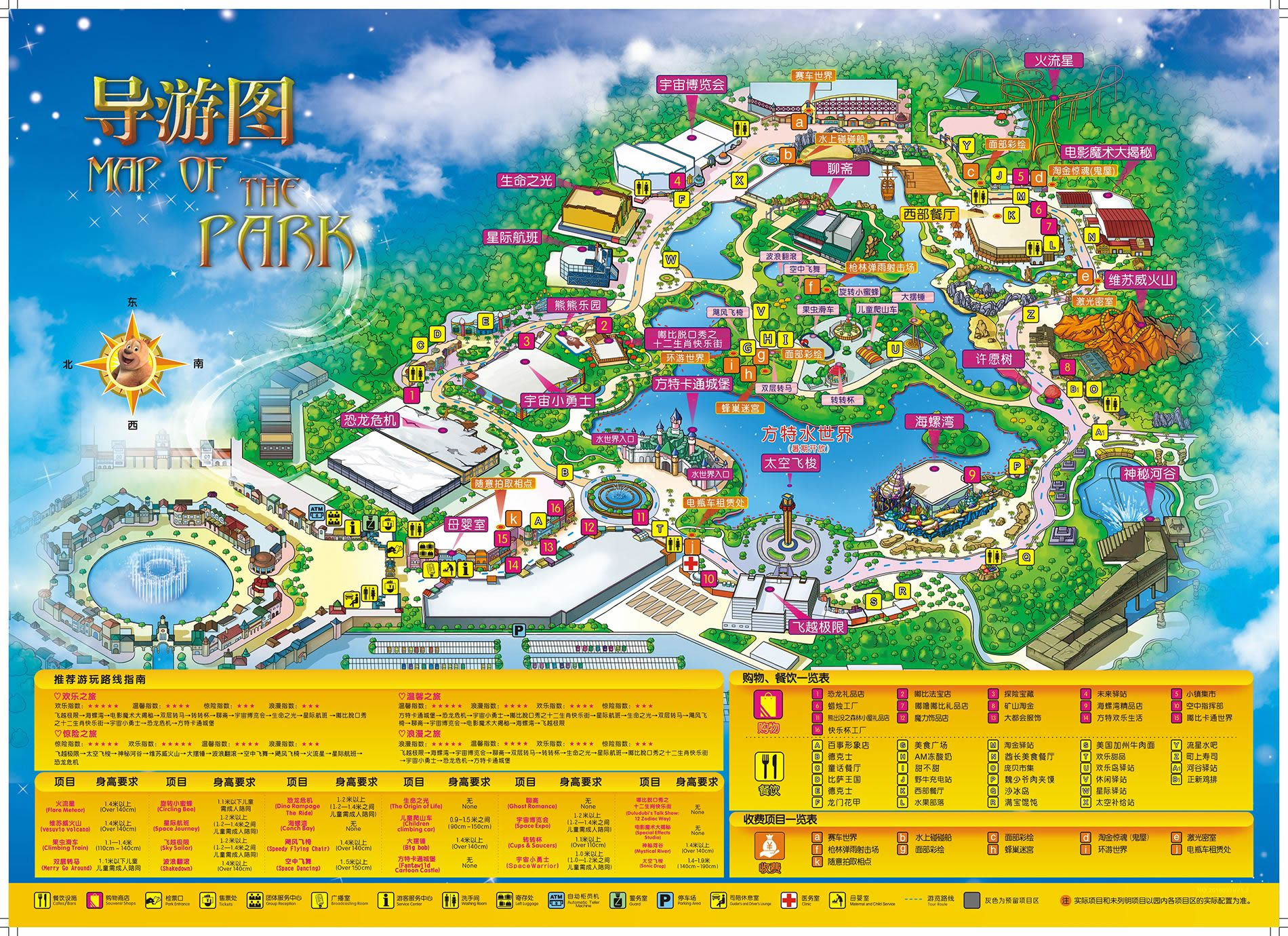 飛越極限→太空飛梭→神秘河谷→維蘇威火山→大擺錘→火流星→颶風(fēng)飛椅→空中飛舞→瘋狂成語(yǔ)→恐龍危機(jī)
