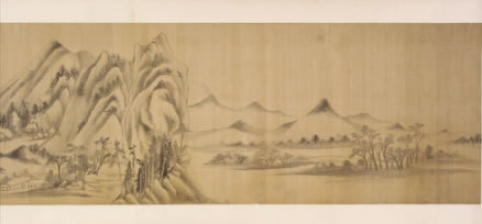 董其昌仿米黃山水圖卷:明晚期,絹本。用筆參以披麻與米點皴法,為其自家面貌。卷后部行書自題:“家有黃子久《富春大嶺圖》、米元暉《瀟湘圖》,和會兩家筆意為此卷,大都子久畫出于巨然與海岳父子同參也!焙笫鹂睿骸岸鬃R”,下鈐“知制誥日講官”、“董其昌印”白文印二方。款側(cè)鈐“楨父審定”、“墨緣堂來氏收藏書畫記”二印。