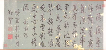 清弘歷行書對雨詩卷:此書卷作于乾隆十八年(1753)。綠色片金蠟箋紙。引首騎縫鈐篆書朱文“石渠寶笈所藏”方印,行書寫自作五言律詩一首,全詩為“細(xì)灑復(fù)絮注,飄蒲爽氣浮。洗車真有雨,壽扇果知秋。池轂紋如疊,檐琴韻轉(zhuǎn)悠。晚來云影散,更喜素蟾流。”詩后自題“對雨作”,后署款“癸酉新秋月,御筆”。