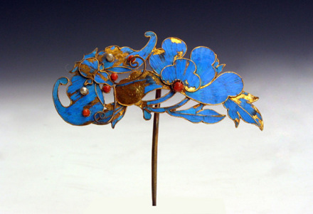 清點翠頭簪:用珊瑚、珍珠制成。整個主題為蝶戀花,蝴蝶在花下,一花開放,旁有兩朵含苞欲放的花,蝴蝶和花均為藍(lán)色,應(yīng)為翠鳥毛制成,花瓣為兩層,均為五瓣,花蕊用珊瑚制成,兩花苞微微下耷,蝴蝶的翅膀為展開狀,蝴蝶的眼睛及翅膀上均有珊瑚珠。