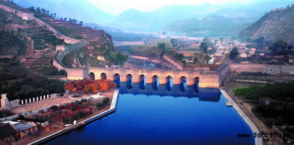 九門口長城:坐落在遼寧省綏中縣李家鄉(xiāng)新臺(tái)子村境內(nèi),距山海關(guān)15公里,全長1704米。其南端起于危峰絕壁間,與自山海關(guān)方向而來的長城相接。自此,長城沿山脊向北一直延伸到當(dāng)?shù)氐木沤幽习,在寬達(dá)百米的九江河上,筑起規(guī)模巨大的過河城橋,以此繼續(xù)向北逶迤于群山之間。“城在水上走,水在城中流。”便是人們對(duì)九門口長城的形象描述。