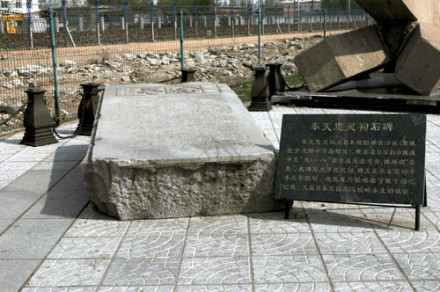 奉天忠靈祠石碑:日本帝國(guó)主義先后在沈陽(yáng)建立了“日俄奉天大會(huì)戰(zhàn)紀(jì)念碑”和“靖國(guó)神社奉天分社忠靈祠、忠靈塔、忠靈碑”,用來(lái)埋葬侵華日軍在日俄戰(zhàn)爭(zhēng)至“九·一八”事變期間戰(zhàn)死者的36400多個(gè)將士的遺骨。