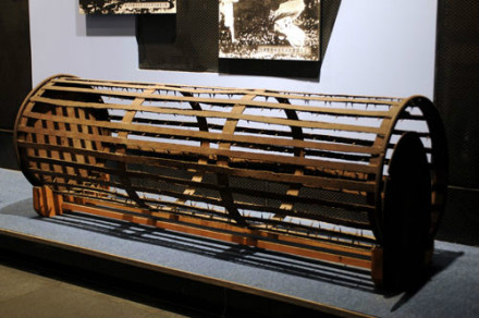 滾地籠刑具:這件黑色的鐵制滾地籠刑具,就是日偽時(shí)期被用于迫害抗日反滿志士及廣大無(wú)辜群眾的刑具。它縱66厘米,橫200厘米,呈圓柱形,中空,籠內(nèi)壁鑲滿鋒利的釘刺,釘尖向內(nèi),側(cè)面為鐵皮蓋,可打開(kāi)。 該刑具原存于沈陽(yáng)階級(jí)教育展覽館,后由遼寧近現(xiàn)代歷史博物館收藏,1998年,調(diào)撥給“九·一八”事變紀(jì)念館擴(kuò)建辦,1999年9月18日轉(zhuǎn)入“九·一八”歷史博物館收藏。