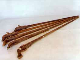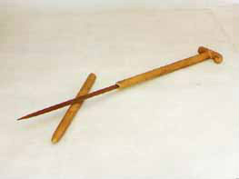 拐杖刀:俗稱“二人奪”,長(zhǎng)約90厘米。表面上看呈拐杖型,木質(zhì)。但實(shí)際上,其前面是可以斷開(kāi)的,拔出外鞘,里面是一個(gè)刺刀。這是抗日斗爭(zhēng)初期,東滿游擊隊(duì)和當(dāng)?shù)厝罕娪脕?lái)對(duì)付敵人的秘密武器。是當(dāng)時(shí)很流行很實(shí)用的武器。