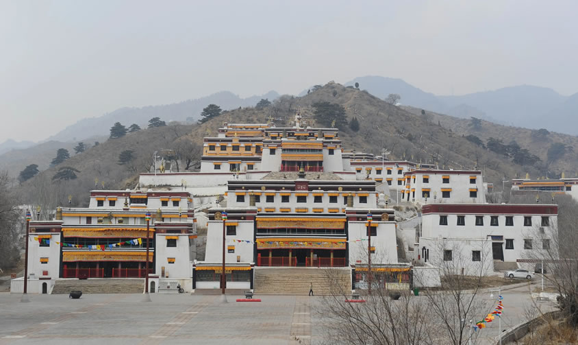 五當召,蒙古語“五當”意為“柳樹”;原名巴達嘎爾召,藏語“巴達嘎爾”意為“白蓮花”,“召”為“廟宇”之意。五當召位于內(nèi)蒙古自治區(qū)包頭市石拐區(qū)東北約45公里的吉忽倫圖蘇木五當溝內(nèi)的大青山深處。始建于清康熙年間(公元1662年—1722),乾隆十四年(公元1749年)重修,賜漢名廣覺寺。第一世活佛羅布桑加拉措以西藏扎什倫布寺為藍本興建,經(jīng)過康熙、乾隆、嘉慶、道光、光緒年間的多次擴建,逐步擴大至今日規(guī)模。因建在五當溝的一座叫做敖包山的山坡上,所以通稱其名為五當召。五當召依地勢面南而建。有大小殿宇、經(jīng)堂、僧舍2500余間,占地300多畝,分布在1.5公里長的山坡上。它是一幢層層依山壘砌的白色建筑,群山環(huán)繞,為蒼松翠柏掩映,雄渾壯觀。 它與西藏的布達拉宮、青海的塔爾寺和甘肅的拉卜楞寺齊名,是中國藏傳佛教的四大名寺之一和內(nèi)蒙古自治區(qū)最大藏傳佛教寺院。