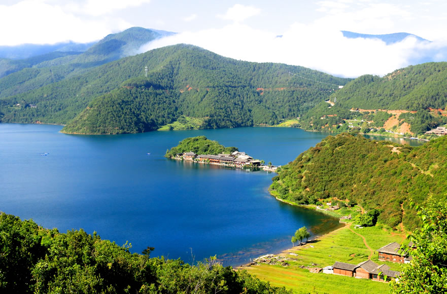 麗江瀘沽湖摩梭文化旅游區(qū),地處麗江市寧蒗縣永寧鄉(xiāng)與四川省鹽源縣左所鄉(xiāng)交界處,是摩梭族人的主要聚居地,素有“高原明珠”之稱,是云南省九大高原湖泊之一。行政區(qū)劃上,瀘沽湖隸屬四川省鹽源縣和云南省寧蒗縣共同管轄,其中四川省鹽源縣管轄東部的29.6平方千米(含沼澤濕地5.8平方千米),云南省寧蒗縣管轄西部的27.0平方千米。瀘沽湖,在地貌區(qū)劃上屬橫斷山系切割山地峽谷區(qū),橫斷山北段高山峽谷亞區(qū)和滇東盆地山原區(qū),滇西北中山山源亞區(qū)交界地帶。瀘沽湖湖岸多彎曲,形成深淵的小港灣,湖中有大小島嶼七個(gè),都是石灰?guī)r殘丘。沿湖東部湖底有長(zhǎng)形深槽,北部和長(zhǎng)島兩側(cè)的湖坡陡峻。湖北面有獅子山,東北面有肖家火山,西南為狗鉆洞山地。