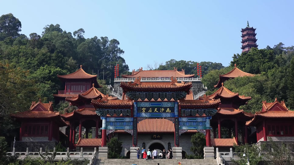 廣州南沙天后宮,又叫“媽祖廟”,位于廣東省廣州市南沙區(qū)天后路88號(hào),坐落于大角山東南麓,地處粵港澳大灣區(qū)之心,瀕臨珠江出?诘牧尕暄,占地面積達(dá)18萬平方米。廣州南沙天后宮前身是明代建于鹿頸村的天妃古廟,清乾隆年間經(jīng)重修定名為元君古廟,抗戰(zhàn)時(shí)期被日寇飛機(jī)炸毀,而后于1994年重建。廣州南沙天后宮是為紀(jì)念海上女神林默而建,是一個(gè)以媽祖文化為主題的景區(qū),是粵港澳大灣區(qū)媽祖文化交流中心,亦是東南亞最大之媽祖廟。廣州南沙天后宮采用清式建筑對(duì)稱布局,高低錯(cuò)落地依山而建,建筑的特點(diǎn)集北京故宮的風(fēng)格和南京中山陵的氣勢(shì)于一體,規(guī)模為現(xiàn)今世界同類建筑之最。廣州南沙天后宮由廣場(chǎng)、宮殿和南嶺塔三部分構(gòu)成,“天后八景”包括:濱海銀灘朝陽、五彩靈徑、媽祖靈釵、“南沙人”遺址、靈宮賜福、南嶺夕照、抗戰(zhàn)神炮、默娘之家八個(gè)景點(diǎn)。