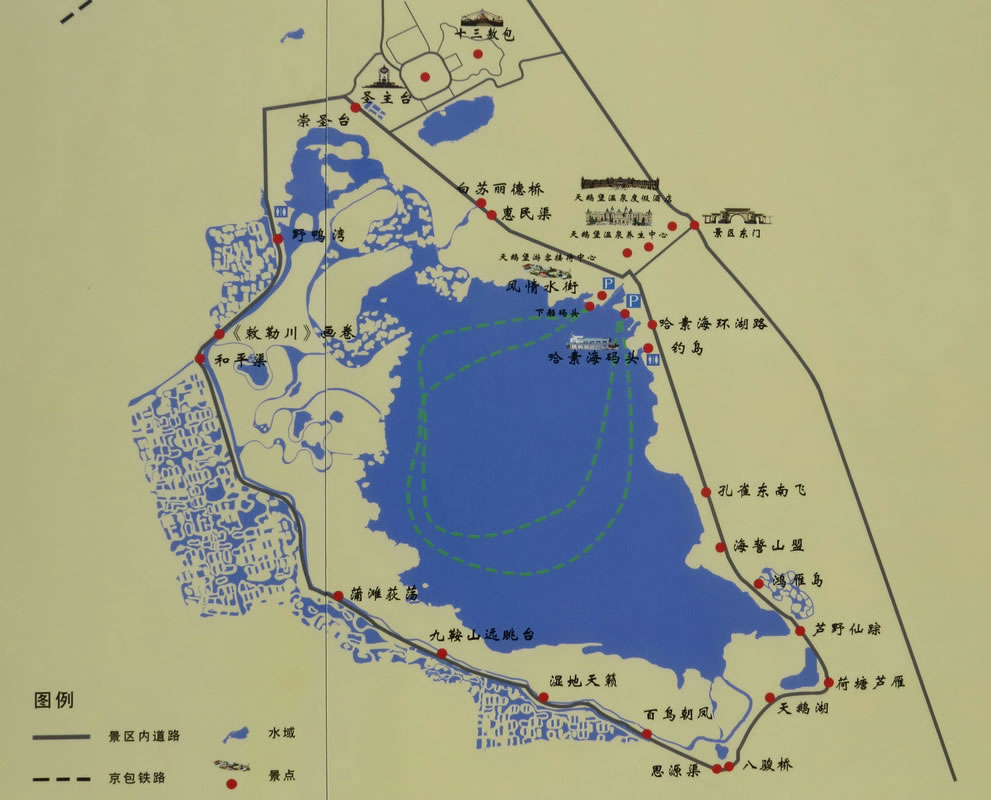 湖內(nèi)有一座水庫(kù)和一個(gè)漁場(chǎng),設(shè)置游船供游客飽覽湖光山色,并可在船上品嘗鮮魚(yú)。哈素海度假村依湖而建,設(shè)有多種旅游項(xiàng)目和服務(wù)設(shè)施。