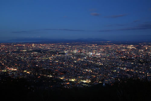札幌自2015年被選為“日本新三大夜景”之一。這座城市的夜幕降臨之后,約200萬人生活的璀璨燈火,與渺無人煙的靜謐山林,勾勒出清晰的明暗交界,十分美麗。而冬季有北海道特有的清冷空氣,與全城積雪帶來的統(tǒng)一色調(diào)與柔和反光加成,更使冬季的札幌夜景別具一格。