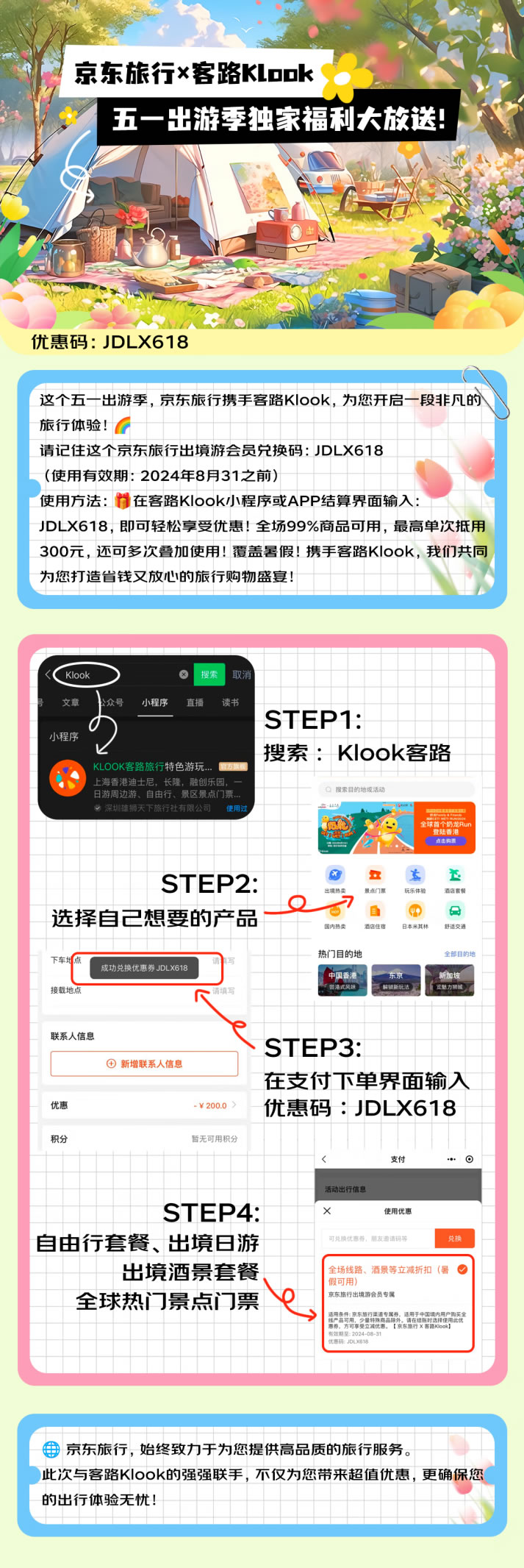 目前,中國已和23個(gè)國家實(shí)現(xiàn)全面互免簽證。相關(guān)平臺(tái)數(shù)據(jù)顯示,今年“五一”出境游熱度飆升,新近免簽的新馬泰更是熱門之選。泰國曼谷芭提雅6日游,帶你去曼谷逛大皇宮、芭提雅看人妖表演、沙美島出海,還提供五星酒店住宿、泰式美食盛宴等,僅5199元起。想自由行,推薦4759元起的馬來西亞吉隆坡6天5晚游,包含北京直飛往返機(jī)票以及1晚網(wǎng)紅酒店住宿。值得關(guān)注的是,京東旅行還攜手專注于境外目的地的旅游體驗(yàn)預(yù)定平臺(tái)客路Klook送上獨(dú)家福利。消費(fèi)者在Klook小程序或者APP下單任何產(chǎn)品,輸入優(yōu)惠碼JDLX618,單次下單享至高300元優(yōu)惠,覆蓋全場(chǎng)99% 商品,且可多次疊加使用。