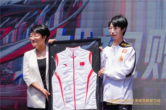 開業(yè)現(xiàn)場還舉辦了隆重的授牌儀式。由杭州第19屆亞運會電子競技王者榮耀亞運版本冠軍選手林恒,上臺將由6位亞運冠軍簽名的戰(zhàn)袍贈予了萬斐酒店騰訊天美電競數(shù)娛空間項目。