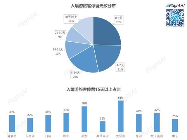 值得一提的是,美國旅客的入境停留時(shí)間也更久:今年整體入境游旅客中,近一半旅客停留天數(shù)在7天內(nèi),34%的旅客停留天數(shù)在15天以上,其中,美加、大洋洲旅客停留天數(shù)更久,超一半旅客停留15天以上。