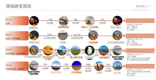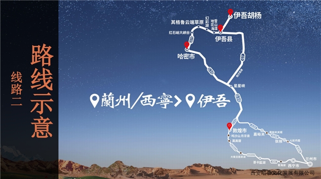 其中線路一“絲路雙珠風(fēng)情環(huán)線”主題為”“千年敦煌·萬年胡楊”——敦煌至伊吾的奇幻之旅。自南一路向北,跨越敦煌、哈密、伊吾,連接甘肅、新疆兩地,全程路線大約640公里。
