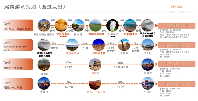 沿途景點(diǎn)涵蓋了蘭州、張掖七彩丹霞、嘉峪關(guān)關(guān)城、敦煌莫高窟、敦煌鳴沙山月牙泉景區(qū)、星星峽、伊吾胡楊景區(qū)、伊吾哈密瓜(淖毛湖鎮(zhèn))、伊水園、伊吾雪山濕地花海、伊吾駝奶基地(鹽池鎮(zhèn))、伊吾幻彩湖景區(qū)、伊吾齊格魯草原、伊吾紅石峪景區(qū)、哈密大海道、回王府、大柴旦翡翠湖、茶卡鹽湖、青海湖、西寧。