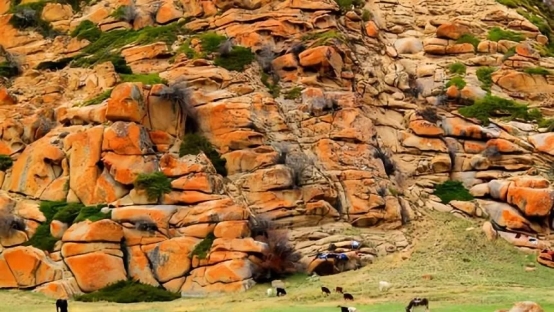 6.伊吾紅石峪(伊吾前山鄉(xiāng)北部山地中,背風(fēng)坡的山地草原,有一片罕見的花崗巖山體,被凜冽的北風(fēng)風(fēng)化成丘陵?duì),巨大的花崗巖則破碎成一個(gè)個(gè)的小塊,花崗巖破碎成類似于黃山飛來石的感覺。