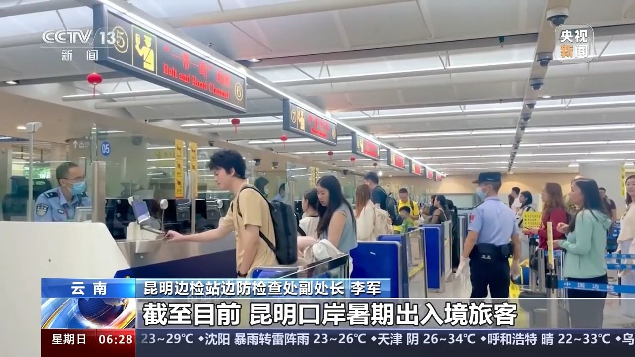 昆明邊檢站邊防檢查處副處長 李軍:截至目前,昆明口岸暑期出入境旅客達到10萬人次,出入境航班達到900余架次,同比增長70.47%和55.34%。