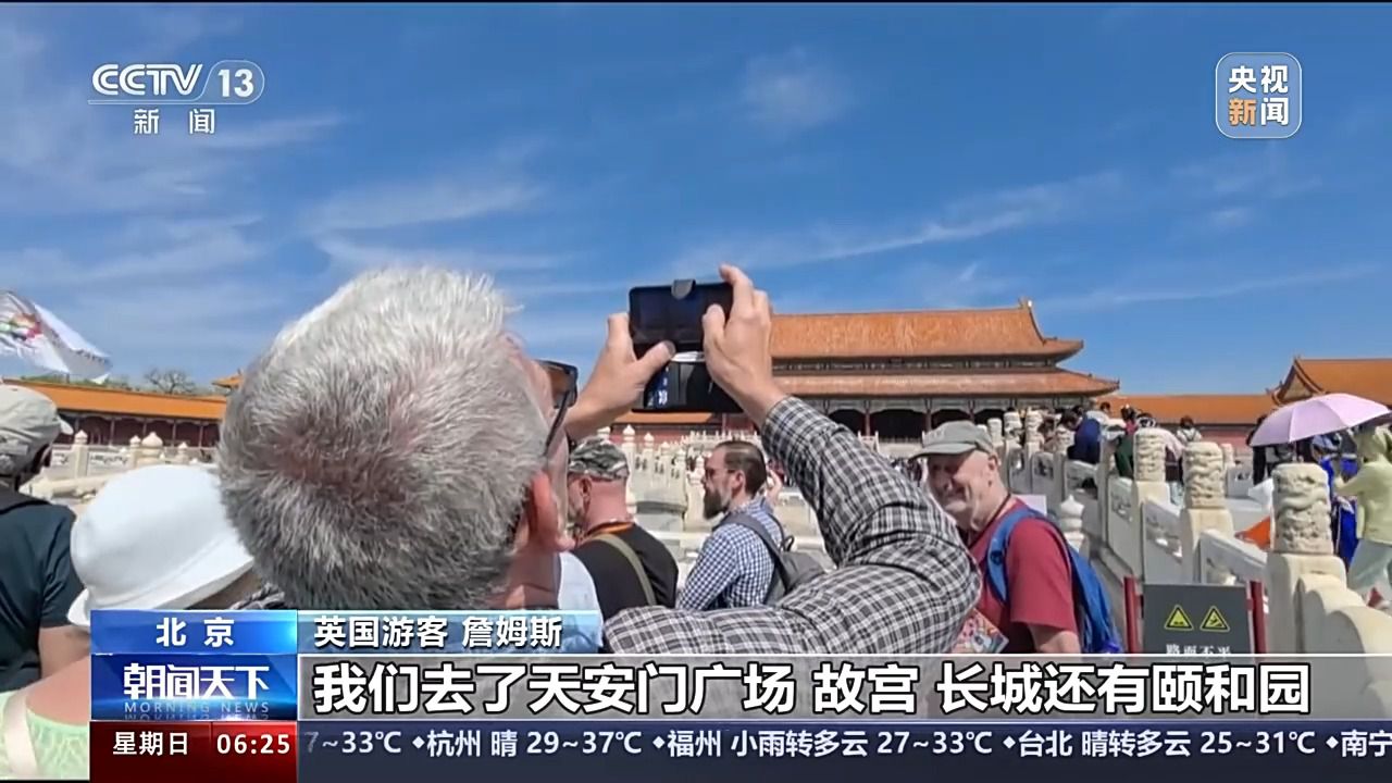 英國游客 詹姆斯:在北京的旅途特別好,我喜歡這里的一切,人、文化和食物等等一切事物。我們?nèi)チ颂彀查T廣場、故宮、長城,還有頤和園。